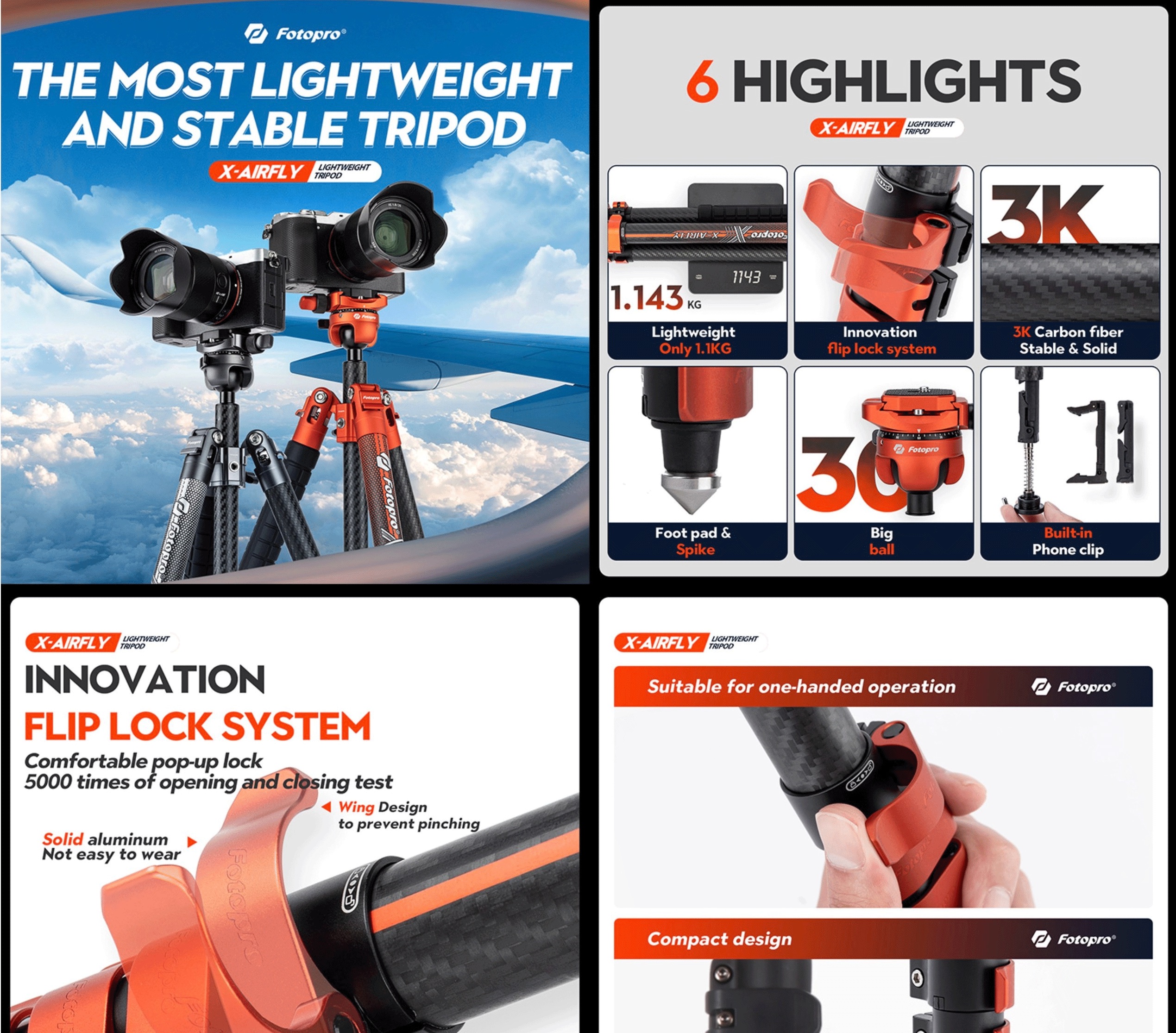 Learn MoreFotopro X-Airfly 63 Inch Carbon Fiber Tripod With Panoramic Ball Head Flip Lock 2 51lb Lightweight Expandable Compact Portable Professional Camera Tripod For Dslr Load Up To 33lb Grey Online At Low Price In India 63 76682314 INNOVATIVE LOCKING SYSTEM: Fotopro X-Airfly lightweight travel camera tripod is equipped with innovative metal plate buckle design, anti-pinch hand more labor-saving; The buckle structure is more compact and saves space. Fotopro X-Airfly Monopod Black 360 degree rotating ball head can quickly adjust angles and is suitable for various shooting environments and photographic needs, even shooting panoramic views efficiently on uneven ground. Marsace XT-15 Featherweight Carbon Fiber Tripod micro SLR camera camera professional portable tripod set It is more durable and corrosion-resistant, with a high-quality feel. 3K CARBON FIBER TUBE: The lightweight travel camera tripod equipped with 25mm diameter 3K twill carbon fiber woven tube has higher strength and is more lightweight, while providing stronger support and more stable shooting. ULTRA LIGHTWEIGHT and COMPACT: Fotopro X-Airfly compact carbon fiber travel tripod for camera only weighs 2.51lbs (1.14kg), but it can load up to 11.02lbs (5kg), the single tripod section load capacity 33.07lb (15kg). And the folding height 17 inches can be easily put into your bag when travelling Fotopro X-Airfly lightweight travel camera tripod only weighs 2., 51lbs(1., 14kg), but the tripod part can support 33., 07lb(15kg), and the overall recommended load capacity is 11., 02lb(5kg). And the folding height 17 inches can be easily put into your bag when travelling. ULTRA LIGHTWEIGHT and COMPACT: Fotopro X-Airfly compact carbon fiber travel tripod for camera only weighs 2., 51lbs(1., 14kg), but it can load up to 11., 02lbs (5kg), the single tripod section load capacity 33., 07lb(15kg).