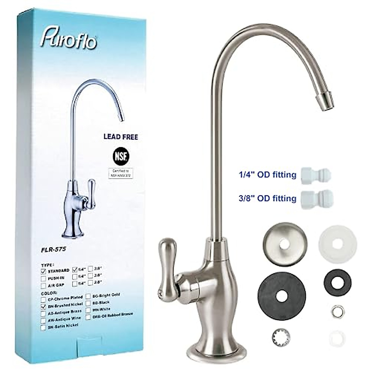 Learn MoreThese attractive kitchen faucets with built in water filters are NSF 61 certified with lead-free, heavy duty materials to guarantee your family with crisp, healthier drinking water. SpiroPure NSF-Certified Lead-Free Air Gap RO Faucet, Matte Black/Oil Rubbed Bronze, Reverse Osmosis Replacement Water Filter Faucet, 3 Line The optional air gap means the faucet can be used as an RO system faucet or as a non-RO, non-air gap undersink drinking water filter faucet. If you are looking for an RO faucet in oil rubbed bronze, we recommend this finish. For RO systems, the air gap is required by US plumbing codes to prevent brine waste from the RO process from mixing with the filtered water. NSF CERTIFIED & LEAD FREE: SpiroPure Reverse Osmosis Water Faucets provide NSF 61 certified, lead-free, and heavy duty materials to provide your family with clean and healthy drinking water. If you are looking for a water faucet in oil rubbed bronze, we recommend this finish. Please note that it is an all black finish and does not have a golden trim. PREMIUM FINISH: This SpiroPure RO faucet comes in an attractive matte black finish. Air gap and 1/4” water filtered tube come attached for ease of installation. Water Filter Matte Black Filtered Reverse Osmosis Faucet - Stainless Steel Purified Water Dispenser Under Sink Water Filter Faucet The tall faucet spout has a 360 degree free swivel design for versatile use, and the durable single-handle easily twists for convenience. Product Features EASY INSTALLATION: Each SpiroPure drinking water faucet comes with everything you need for a successful installation to your undersink water filter system, including washers, a wing nut, an optional spacer, and a union adapter with 1/4 or 3/8 connection options to fit your system's water line. OPTIONAL AIR GAP: The air gap in this faucet is optional, making it a great... EASY INSTALLATION: Our 3-line water filtration faucets come with the air gap and 1/4” water filter tube already attached for easier installation. SpiroPure NSF-Certified Lead-Free Air Gap RO Faucet, Polished VERSATILE DESIGN: Our premium stainless steel faucet spout swivels 360 degrees to allow for more convenience and versatility in the kitchen.