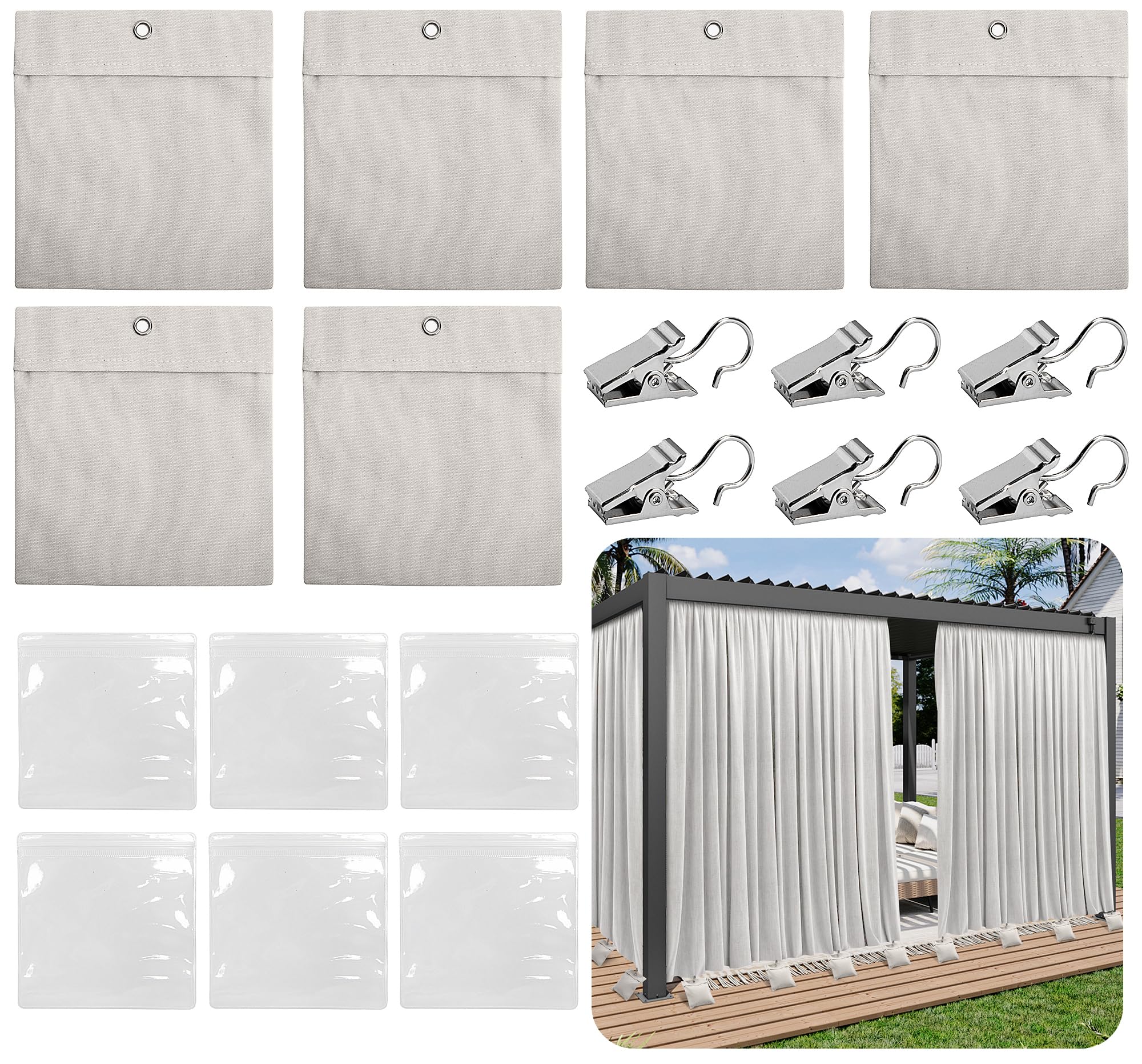 Learn More【Easy Installation】Simply fill sand or gravel into the provided PVC lock bag, put it in the curtain weight bag and attach to the metal clip, a quick fix to stabilize your outdoor curtains in minutes. 【Self-adhesive Design】 Each outer curtain weight has a convenient self-adhesive closure that protects the filling material on the spot. Outdoor Waterproof Grommet Top Weghted Curtan For Pato 1 Panels 2... Colour: as shown in the picture. You can adjust the weight by filling water, sand or stones., 3., The PE bag is well sealed and effectively prevents fine sand or sucking moisture, so that the inside of the linen bag remains clean and contamination of curtains, tablecloths and other fabrics is avoided., 4., Weatherproof gazebo curtains with metal clips can not only fix curtains, but also tablecloths, shower curtains, picnic mats and much more, making them versatile., Specification: Material: canvas. 4x Weight Bags Sand Bags Weighted Feet Bag for up ... - Vicedeal 1)The canvas bags are reusable and durable, while transparent PVC bags allow easy filling with sand, stones, or water for adjustable weight. (2)Compact size makes storage hassle-free, and versatility allows use beyond curtains, such as securing tablecloths, shower curtains, and picnic mats 【High quality material】 The curtain collar under the outside is made of high canvas, the fabric is thick and wear-resistant, with stainless metal brackets, the clips bite firmly and the clamping power is even to ensure that the weight bag fits tightly with curtains, tablecloths and other fabrics to ensure durability. The low weight can easily be stored in tool boxes or in the side pockets of backpacks and is quickly within reach during camping trips and patio parties. 【Wide Application】Outdoor curtain canvas weights can be hung on the underside of curtains for weight gain, and can be used to fix corners of picnic mats, umbrella cover curtains or tent door. Sandbag Weights 12 Pack Outdoor Curtain Weights, Portable Weight Sandbag For Pergola Drapes, Cabana, Gazebo & Garden Tents, Heavy Duty Drapery Weights With Windproof Design To Secure Tablecloths & Outdoor Curtains Curtain Weight Bags They are suitable for patios, campsites, market stalls and other locations and keep fabric items flat and stable in strong winds so that it is not blown away or slipped and damaged.