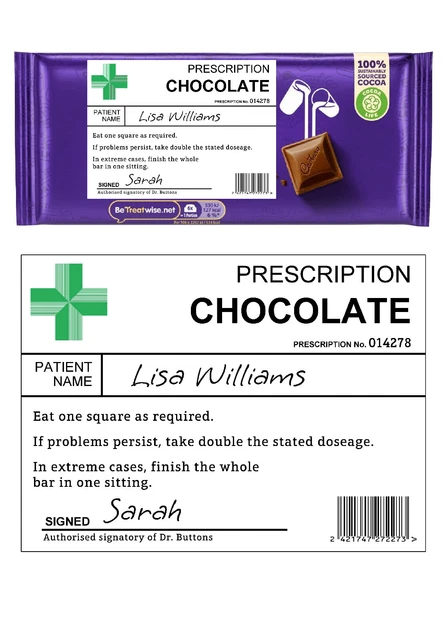 Chocolate Prescription Stickers RX Chocolate Prescription Label. Printable Novelty Gift. Chocaholic Gift For Children And Adults Medical Joke Stickers 5 Pack There is space on the form to write down a patient name and who its from, we recommend using a permanent marker & writing on the label before application., Sticker Size Size: 8., 5 x 5., 5 cm You receive the stickers not any chocolate. Check out our funny chocolate bar wrapper prescription selection for the very best in unique or custom, handmade pieces from our templates shops Make sure that you measure the bar you will use, to make sure that the stickers will fit! Funny prescription-style chocolate stickers – transform any regular bar into a medicinal pick-me-up. A brilliant novelty label that adds humour and charm to gifts for friends, family, or coworkers Novelty Chocolate Prescription Medical Sweet Label Gift Funny Prank Sticker Just stick them on your food!, !, ! Printable Chill Pill Label Template Product type: STICKER DECAL