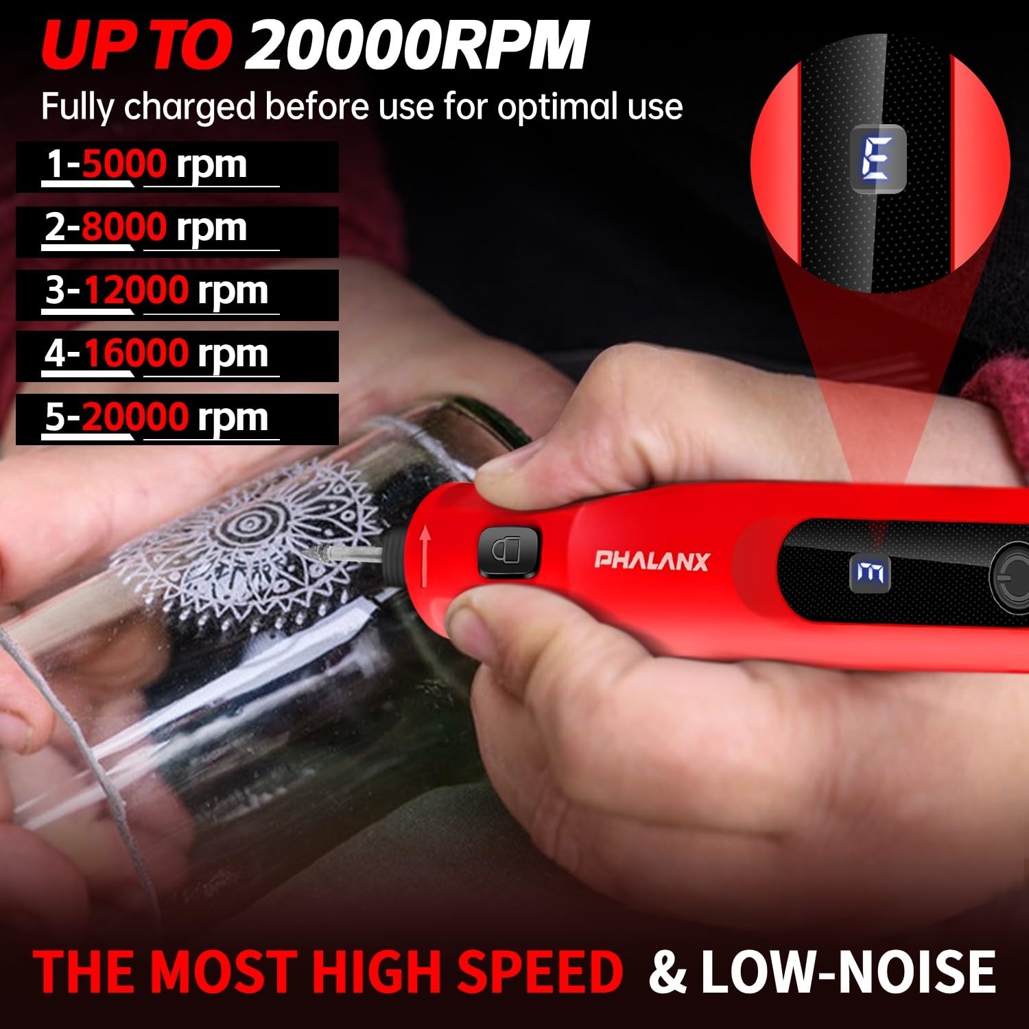 Learn MorePower Rotary Tools - 3., 7V Rotary Tool Kit 70 Accessories, Rotary Tool Cordless 5 Speed Settings LED Indicator Light 5000-20000 rpm, Multi-Purpose Mini Grinder for Wood Carving/Polishing/Sanding Tool DEPSTECH Rotary Tool Cordless Kit, 30000RPM Multi Power Carving Tools The engraving tool is ideal for polishing and grinding pet nails as well as for light cutting and drilling functions. Equipped with a Type-C charging interface and a charging cable, it is compatible with various USB output device power sources and can be easily charged anytime and anywhere. While effectively controlling vibration and noise to provide stable performance. The mini grinding tool is equipped with a non-slip rubberized handle to provide a comfortable grip. Intelligent memory and compact lightweight: PHALANX battery rotary tool remembers the current speed setting within 5 minutes after shutdown. After 5 minutes, it returns to the standard 3rd Speed back. Mini power tools have built-in power and transmission indicator panel clearly indicate, so you don't have to worry about the battery suddenly running out. Powerful motor and low power consumption: PHALANX rotary tool uses an improved strong magnetic 280 motor, the output is more powerful than the traditional 180 motor, with a maximum speed of up to 20000 rpm. 5 Speed Rotary Tool 20000 RPM DEPSTECH Rotary Tool Cordless Kit, 30000RPM Multi Power Carving Tools DIY Polishing Engraving Tool There is no need to adjust the gear frequently after shutdown to check the work results or a short break. VEVOR Rotary Tool Kit Cordless 118PCS, 8V Power Rotary Tools 5000-25000RP Variable Speed with A... LARGE CAPACITY BATTERY & TYPE C FAST CHARGE The PHALANX cordless rotary tool is equipped with a 2000mAh battery. Cordless Rotary Tool 3.7V Ini Rotary Tool Kit USB Charging Power Rotary Tool Mini Grinder For Sanding Polishing Engraving 2065662895 It is an amazing gift for people who are interested in handmade things and DIY enthusiasts