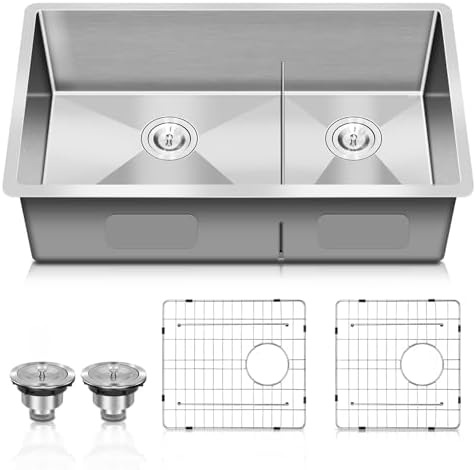 (Does not include a garbage processor, you need to buy it separately)▏Limited Lifetime Warranty - Logmey USA Stainless steel kitchen sink with an X-shaped diversion water design with a slightly tilted bottom to prevent standing water from quickly draining in the bowl without clogging. The double bowl design allows for multitasking in the kitchen ▶Undermount sinks quality materials and construction: Dent-resistant T304 stainless steel in TRU18 real 18-gauge for superior strength and durability. BLANCO Precis Silgranit Undermount 33-in X 18-in Granite Double Offset Bowl Kitchen Sink Quiet Soundproof Sink Logmey 33" L X 19" W Undermount Single Bowl Kitchen Sink Rectangular Stainless Steel Workstation Kitchen Sink Owpq1778 33 Inch Undermount Kitchen Sink ▶Included in the box: 33“ Undermount Kitchen Sink, 2 pcs bottom grid,2 pcs drainer, roll-up rack, mounting clips, cut out template, and installation introduction. Logmey 33 Inch Double Bowl Kitchen Sink 50/50 Dop in 33x22 Big and deep double bowl sink allows you to soak and clean cookware and bakeware in different basin ▶Sink Dimensions: 33 x 19 x 9, Bowl Depth: 8., 75 ▏ (MINIMUM BASE CABINET SIZE: 36 inches, Please confirm the size of your home cabinet and choose the correct sink size to purchase); Right bowl inner size: 12 x 17 x 8., 75; Left bowl inner size: 18 x 17 x 8., 75., Standard 3., 5 drain opening will fit any garbage disposal unit. Gives you a quiet, beautiful, and elegant kitchen.